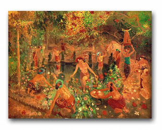 Le Mayeur spent his time in Bali painting in a garden paradise. After a few years and some successful exhibits, he built a house on the beach at Sanar and married his longtime model, Ni Pollok. Ni Pollock remained Le Mayeur’s muse and appeared in most of his paintings. Together they created works which showcased the beauty of the environment around them; works like Women Making Offerings at Sacred Pond (1958) depict a group of women in traditional Balinese costume, framed by blossoming flowers and littered with glittering light. The nymph- like figures dance around the frame and tend to an illustrious garden pond. Ultimately, it is Le Mayeur’s ability to create this type of mythical mirage from another time and place that make his paintings so successful and sought after. [To the right, Le Mayeur and his wife Ni Pollock; Attribution: Tropenmuseum of the Royal Tropical Institute (KIT)]